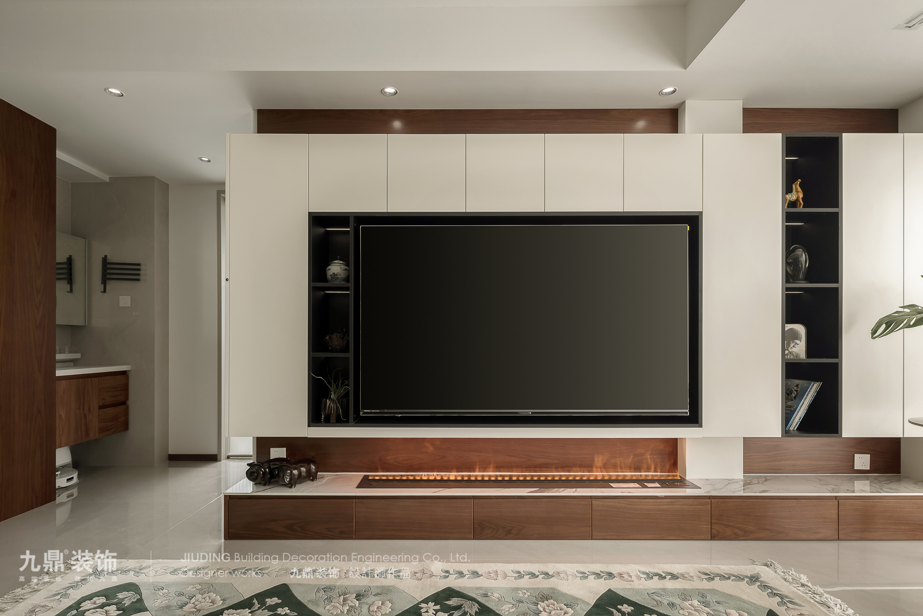 整墻電視收納柜: 取代傳統電視柜。采用“藏八露二”原則,80%柜門(無把手設計更簡潔)隱藏雜物、藥品、工具箱;20%開放格展示書籍、收藏品。電視嵌入其中,整體感極強。