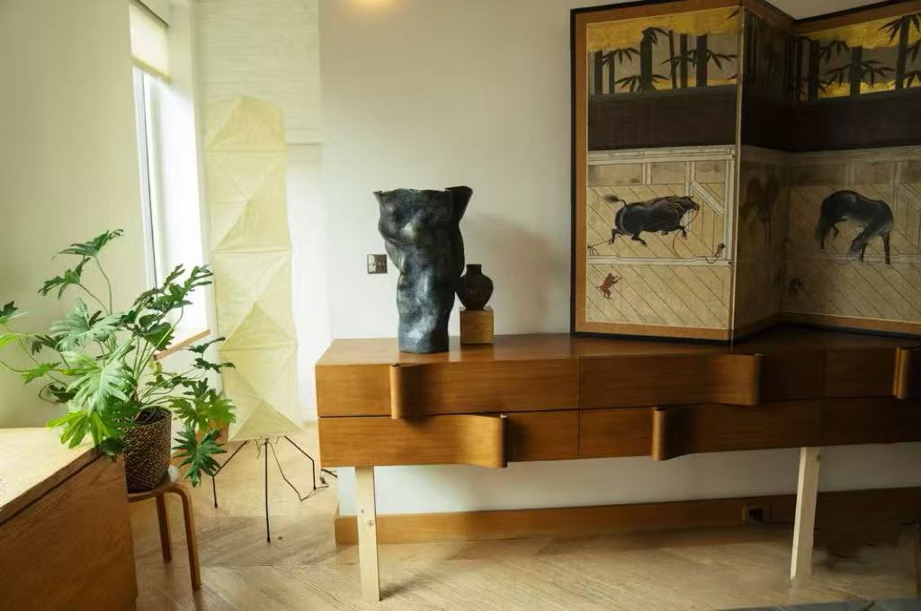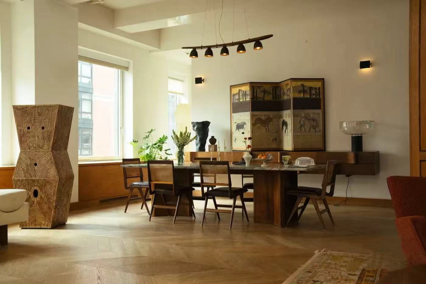 走進(jìn)這個(gè)家,仿佛步入一場靜謐的“老錢”美學(xué)盛宴。腳下是溫潤典雅的Herringbone人字拼木地板,胡桃木臺(tái)面與通頂?shù)亩ㄖ颇咀鳝h(huán)抱四周,每一處細(xì)節(jié)的收邊與質(zhì)感,都在無聲地訴說著精致。而布景師的精心點(diǎn)綴,更讓空間格調(diào)升華。這里擺放的,是Philippe Starck、Charlotte Perriand等設(shè)計(jì)大師的經(jīng)典燈具;墻上懸掛的,是Francesco Clemente、Saul Leiter等藝術(shù)家的原作。它們不是冰冷的道具,而是與空間、與人物對(duì)話的靈魂。