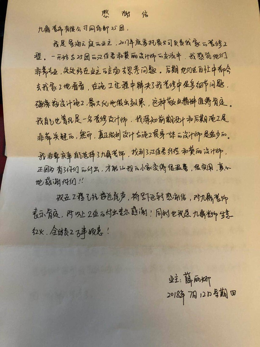 現(xiàn)在工程已經(jīng)接近尾聲,將寫(xiě)下這封感謝信,對(duì)九鼎裝飾表示肯定,對(duì)以上兩位的付出表示感謝!同時(shí)也祝愿九鼎裝飾生意紅火,全體員工萬(wàn)事順意!