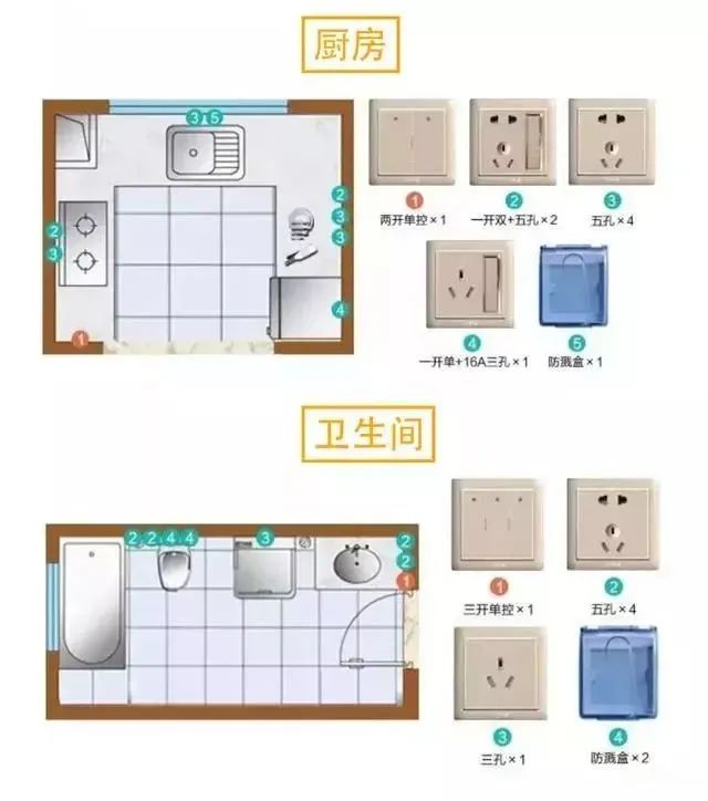 衛(wèi)生間空氣潮濕,經(jīng)常用水,插座要帶防濺盒。