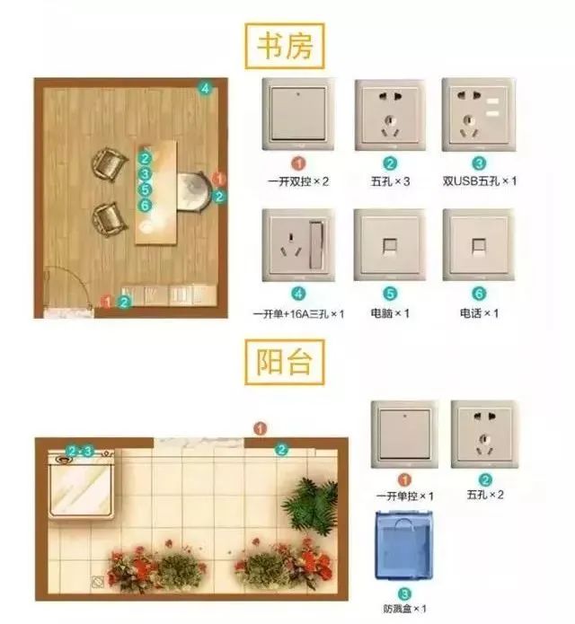 6. 陽臺:1個陽臺開關(guān)、1個陽臺插座、1個陽臺照明開關(guān)、1個陽臺照明插座、1個陽臺插座(備用)、1個陽臺插座(備用)。