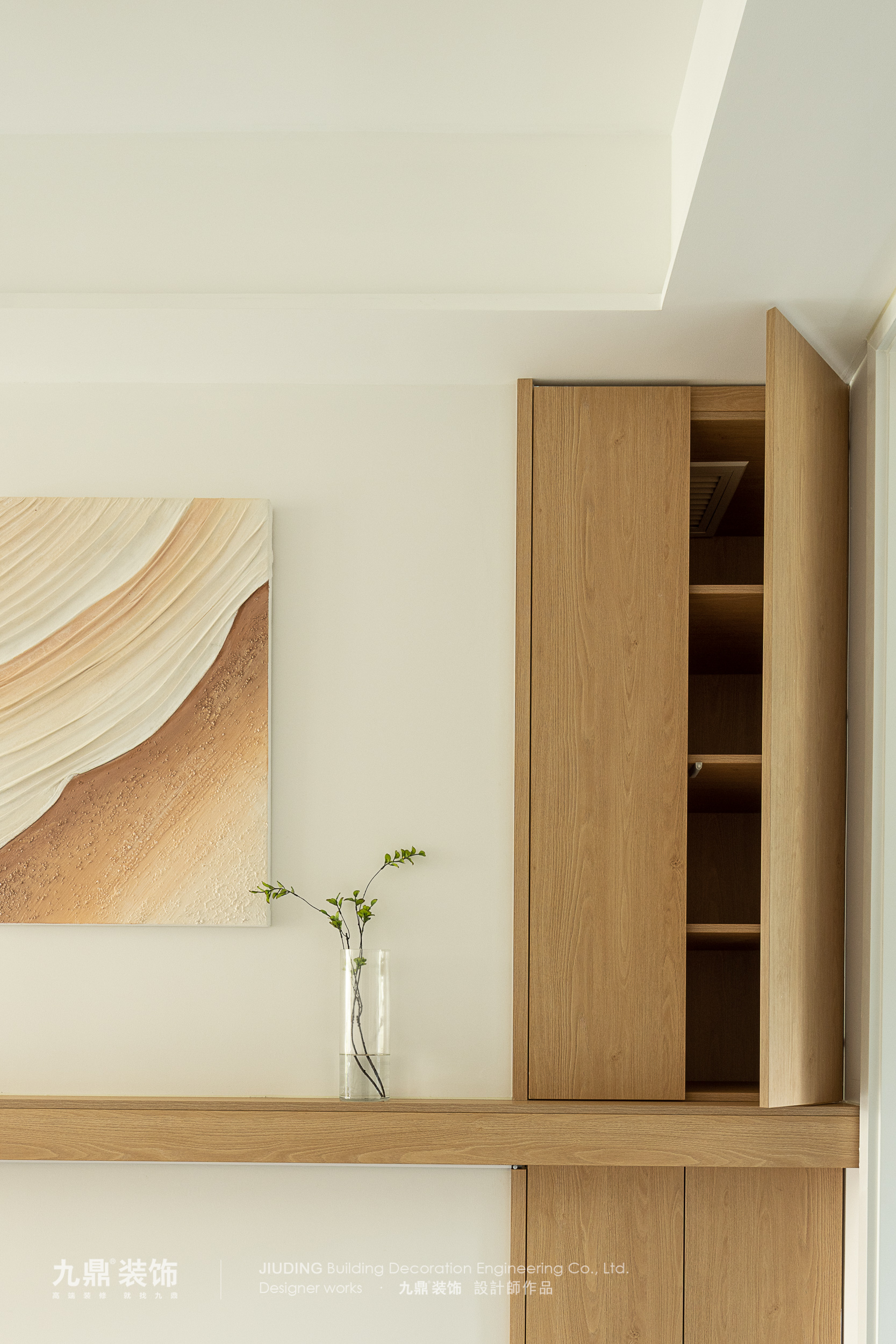 2.細節收口更從容,提升空間利用率別看拉手很小,但在某些情況下非常影響細節處理。舉個例子:a.如果你家是做“電視柜+投影幕布”的組合,無拉手柜門能讓幕布完全緊貼柜面下降。而有拉手的話,幕布和柜子之間就得留縫隙,不僅影響美觀,拉手還可能摩擦幕布,縮短其壽命。b.在一些狹窄位置或L形轉角柜中,無拉手也能避免開門時拉手互相“打架”,或者撞到旁邊的墻,開門更自如。